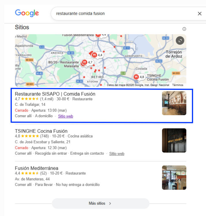 En este caso, trabajamos el SEO local de Sisapo y conseguimos posicionar el restaurante en el top 1 para una búsqueda clave en su zona: «restaurante comida fusión», aumentando su visibilidad justo en el momento en el que el cliente decide dónde ir.